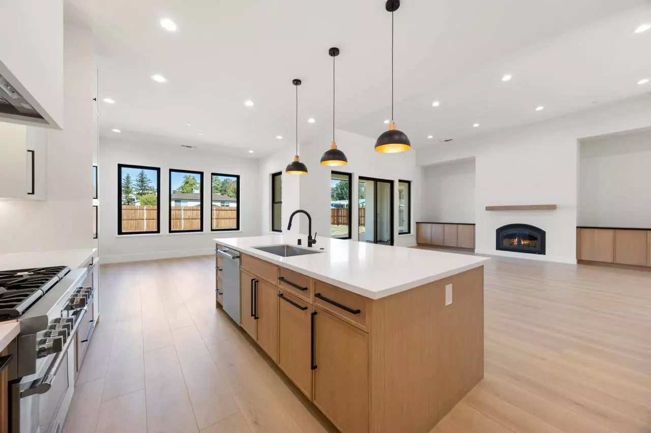 This kitchen’s large island serves as a versatile centerpiece, offering a built-in sink, ample storage options, and an expansive countertop space for meal prep, casual dining, or hosting social gatherings. Combined with an open-concept layout, this design provides plenty of room to move and work, ensuring maximum comfort and usability.
